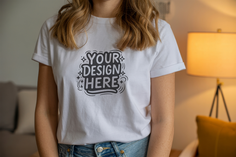 Modern Trendy Lifestyle Women Home Cozy Tshirt Mockup Lamp Light Cotton Tee Casual Outfit