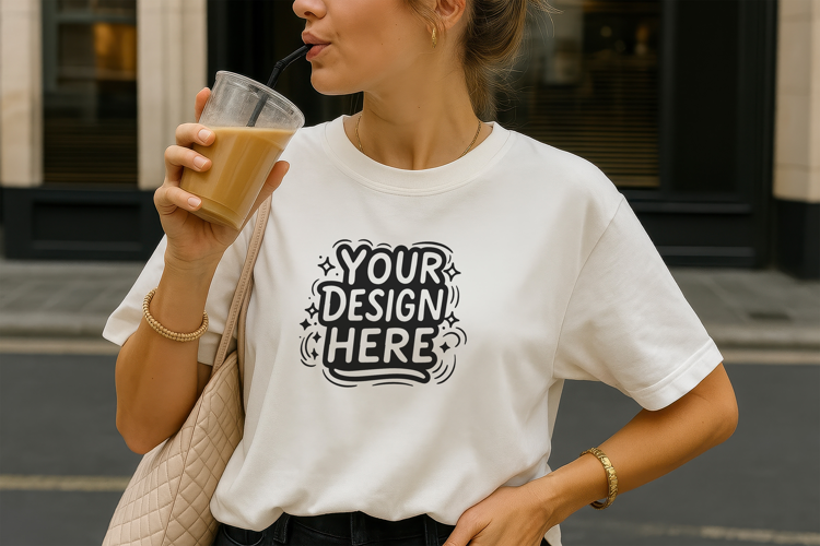 Modern Trendy Fashion Lifestyle Women Apparel Cozy Coffee Cup Tshirt Mockup White Tee
