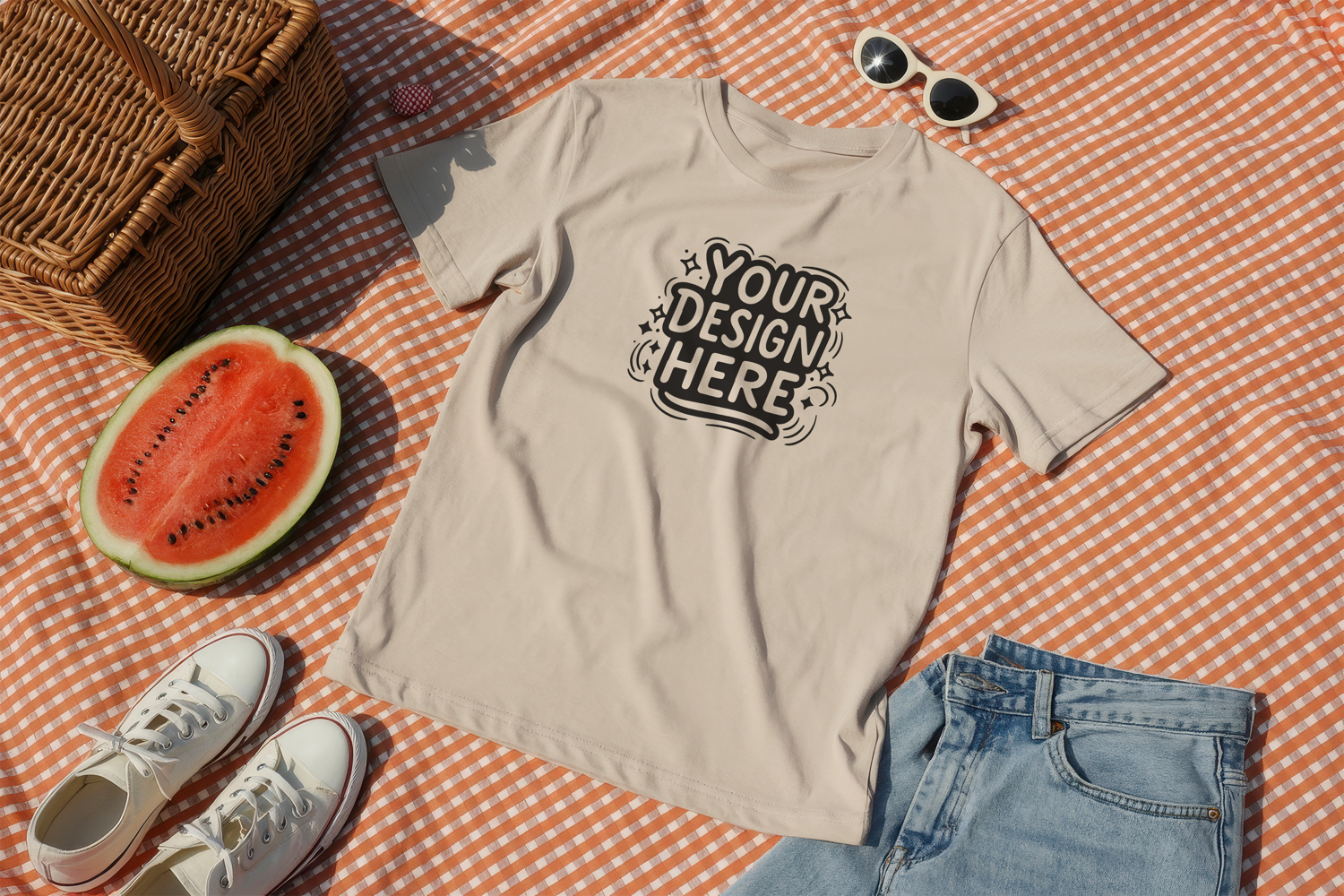 Trendy Summer Watermelon Cozy Apparel Mockup Flatlay Tshirt Mockup White Tee Bright Tone Cotton Shirt