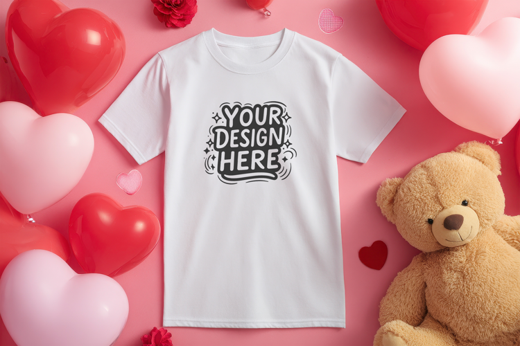Valentine Romantic Hearts Teddy Bear Cozy Apparel Mockup Flatlay Pink Balloons Tshirt Mockup Love Theme
