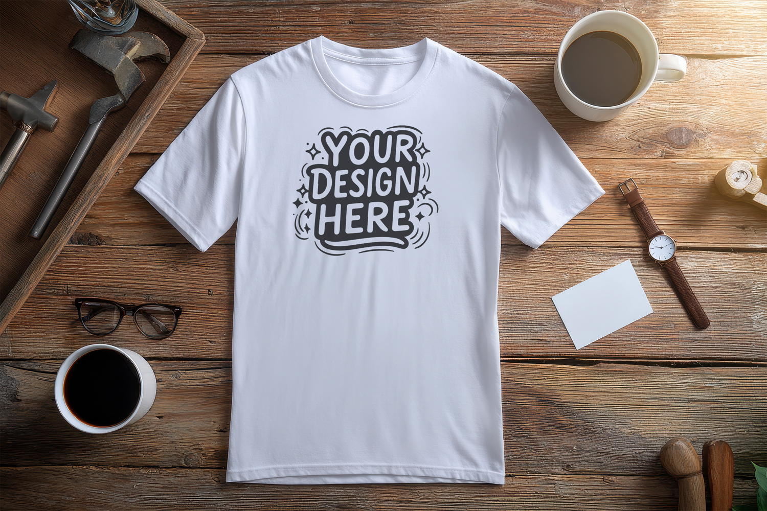 Office Coffee Flatlay T-Shirt Mockup PSD JPG