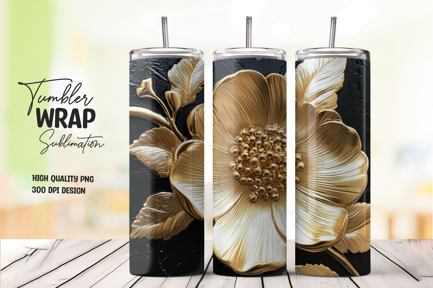 Elegant Gold Flower Luxury Png Metallic Wrap Sublimation Tumbler 20oz Tumbler