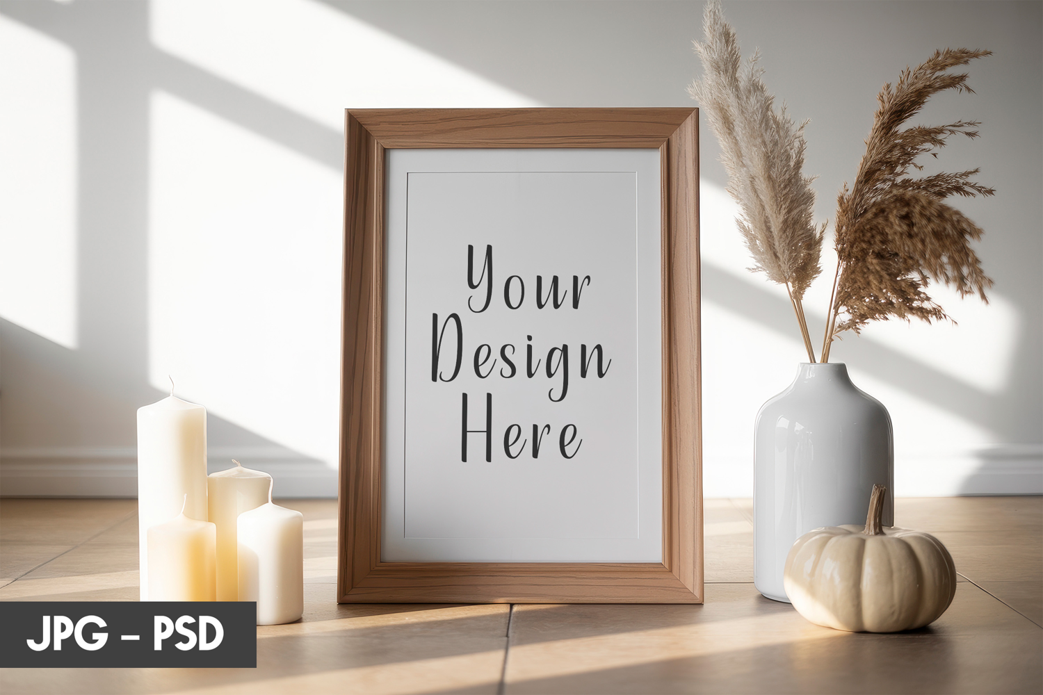 Frame Mockup Psd Vertical Frame Psd Poster Display Mockup Warm Light Mockup Candle Decor Frame Cozy Interior Frame Dried Plants Setup Rustic Wall Styling Home Decor Frame Natural Warm Scene