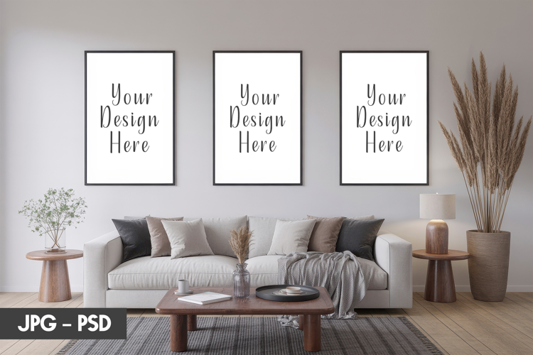 Frame Mockup Psd Modern Interior Decor Realistic Wall Mockup Framed Artwork Psd Wide Frame Display Triple Poster Wall Neutral Warm Palette Minimal Cozy Styling Clean Soft Backdrop Horizontal Frame Layout