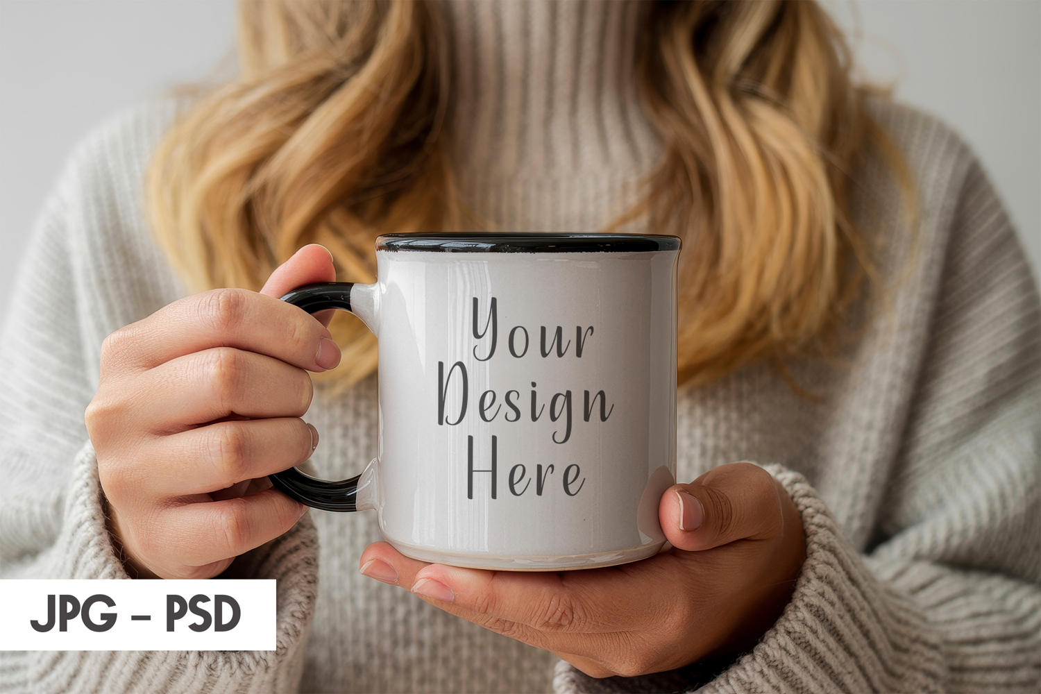 Woman Holding Mug Mug Mockup Psd Photorealistic Mug Scene Relaxed Cozy Mug Warm Sweater Vibe Ceramic Cup Psd Lifestyle Product Display Cozy Indoor Lighting Warm Home Ambiance Stylish Drinkware Mockup