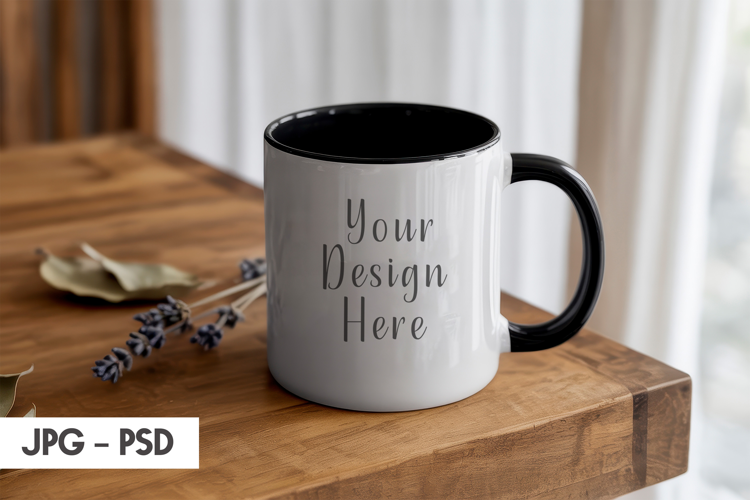 Mug Mockup Psd Ceramic Cup Mockup Black Accent Mug Lavender Decor Touch Two Tone Drinkware Rustic Tabletop Styling Cozy Warm Light Photorealistic Mug Display Mug Branding Psd Natural Wood Setup