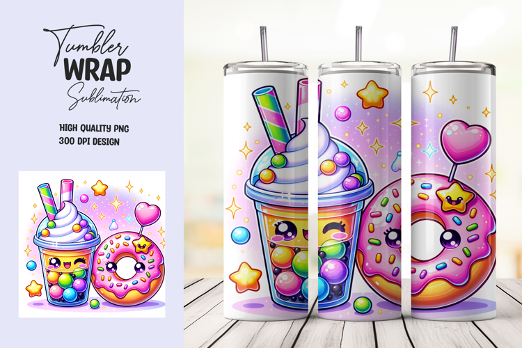Cute Kawaii Donut and Boba Tumbler Wrap PNG