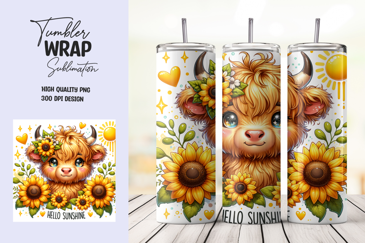 Hello Sunshine Sunflower Highland Cow Tumbler Wrap PNG