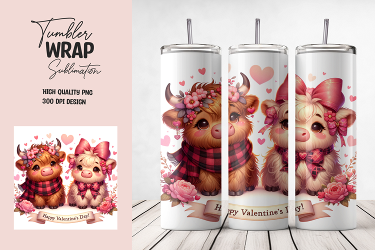 Valentine Highland Cow Tumbler Wrap | Cute Floral Love PNG