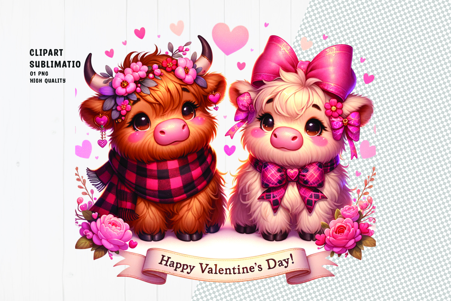 Cute Valentine Highland Cow Couple Clipart PNG example image 1