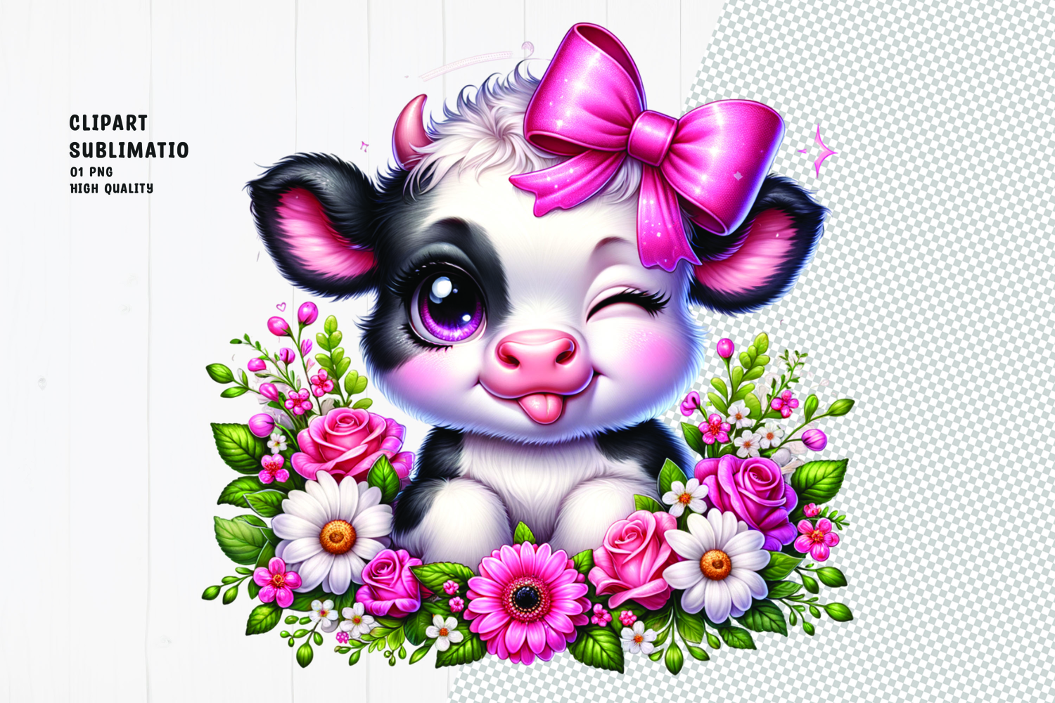 Cute Cow Clipart Farm Animal Sublimation Cow With Flowers Png Girly Cow Design Pink Bow Cow Kawaii Calf Png Adorable Cow Face Pastel Floral Farm Animal Kids Cute Artwork Winking Cow Illustration