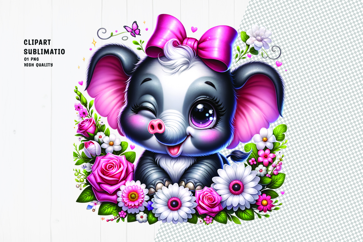 Winking Elephant With Pink Bow & Flowers example image 1