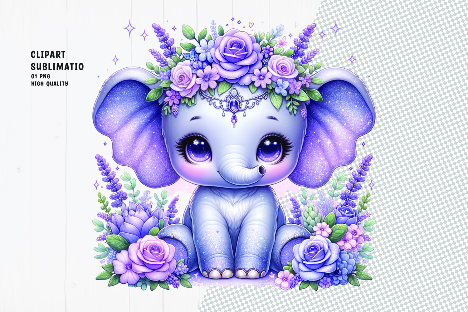 Floral Baby Elephant Clipart | Lavender Flowers & Sparkle example image 1