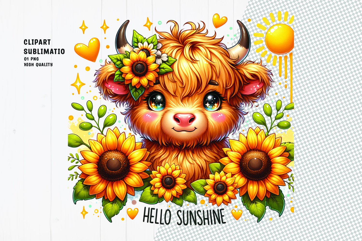 Sunflower Highland Cow Clipart | Hello Sunshine Cute Cow Sublimation PNG