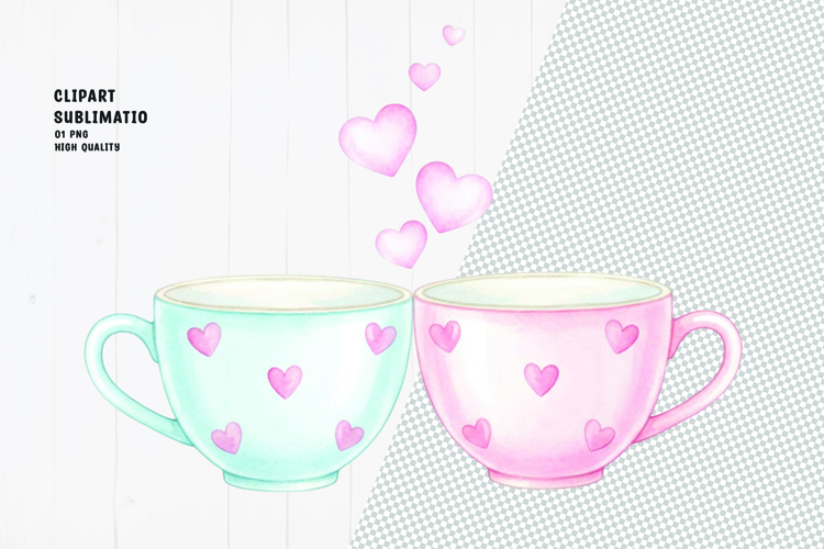 Blue & Pink Heart Cups Watercolor Clipart Sublimation PNG example image 1