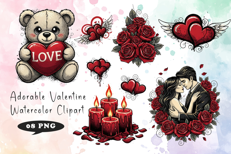 Adorable Valentine Watercolor Clipart – Teddy Bear, Roses & Romantic Elements