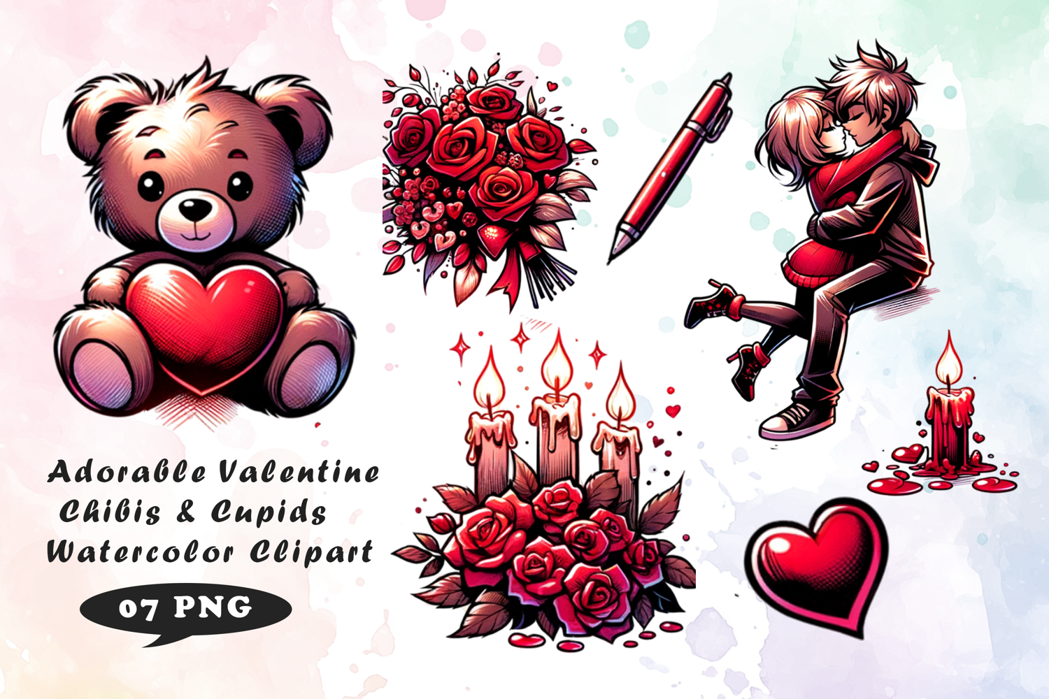Adorable Valentine Chibis & Cupids Watercolor Clipart