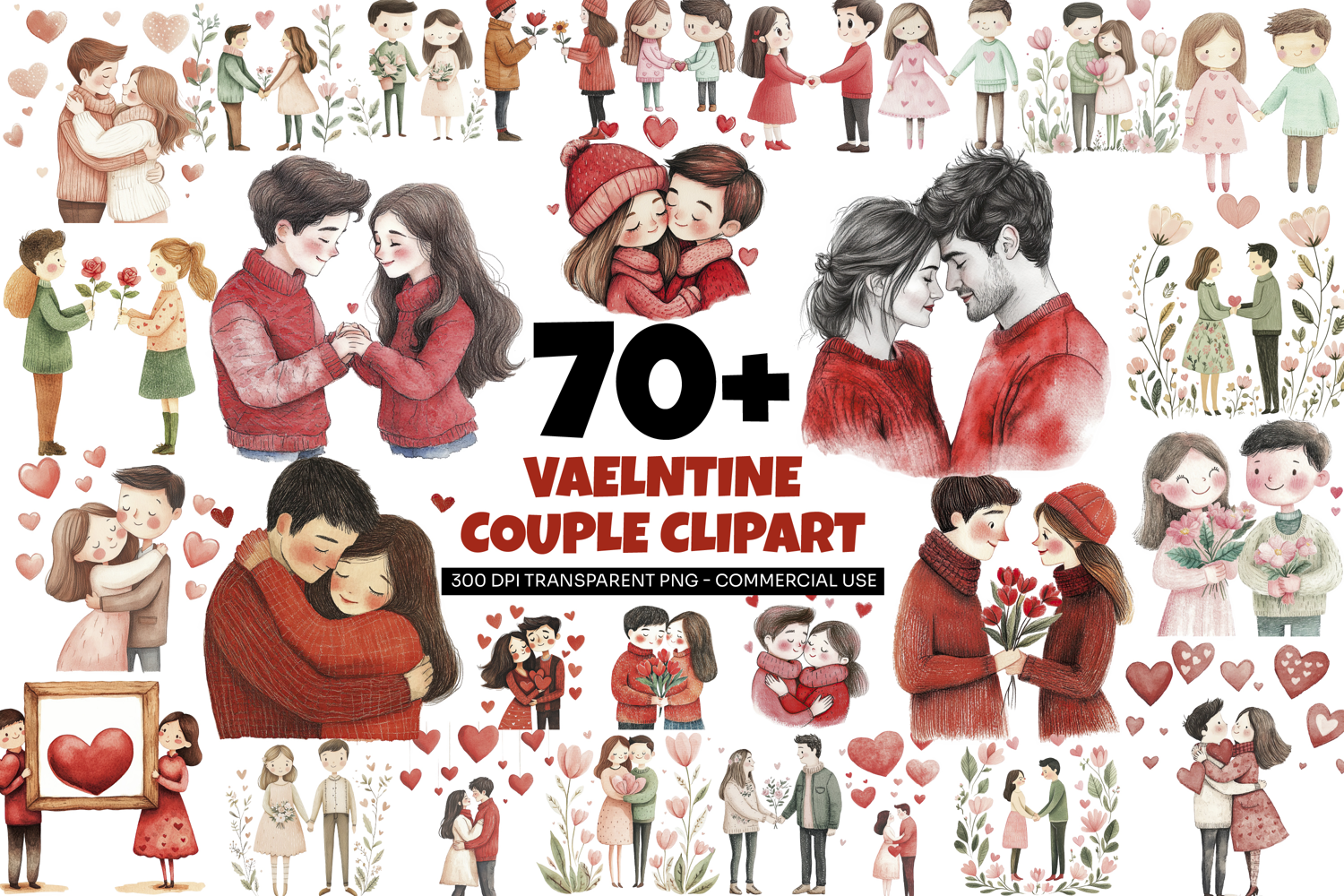 This collection features cute boy and girl couples in romantic Valentine-themed poses such as hugging, holding hearts, giving flowers, and sharing sweet moments. These illustrations are perfect for Valentine’s Day crafts, gifts, and digital designs.