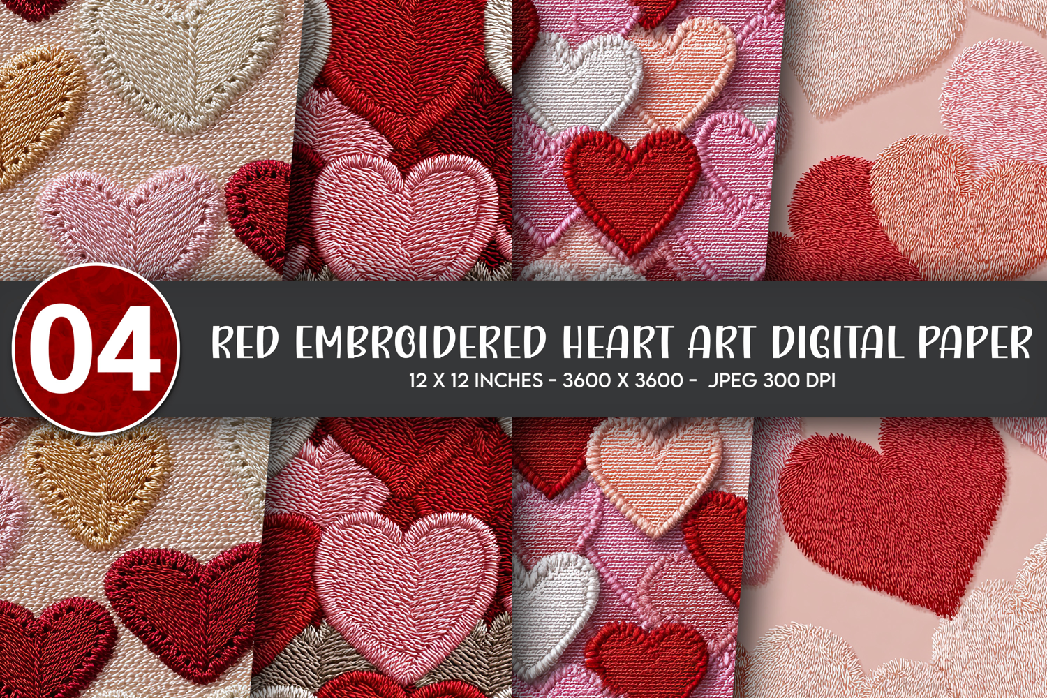 Red Embroidered Heart Art Digital Paper