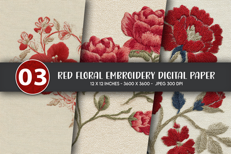 Red Floral Embroidery Digital Paper