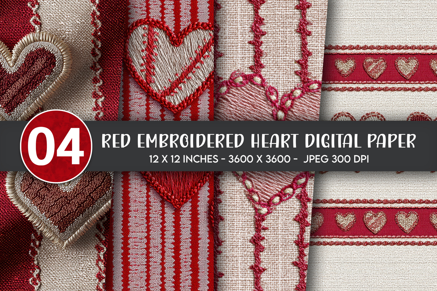 Red Embroidered Heart Digital Paper