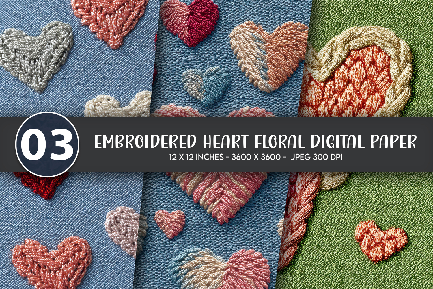Embroidered Heart Floral Digital Paper