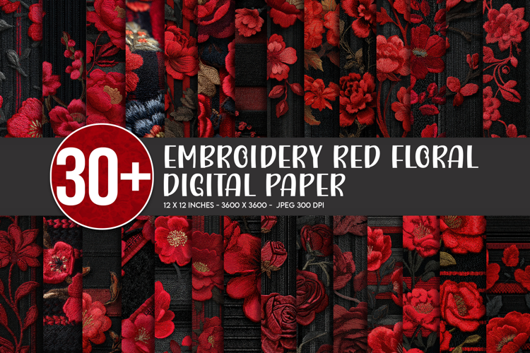 Embroidery red floral digital paper pack featuring dramatic rose and flower designs on deep black textured backgrounds, perfect for gothic romance and luxury creative projects.
