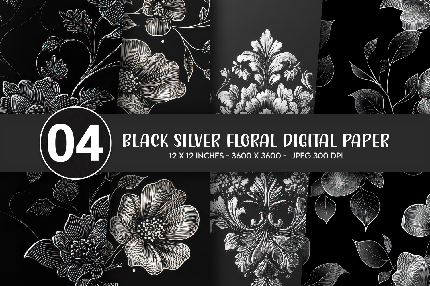 Black Background Hand Drawn Flowers Botanical Illustration Vintage Flower Design Silver Floral Pattern Metallic Floral Art Dark Nature Pattern Elegant Bloom Texture Luxury Floral Motif Monochrome Petal Art