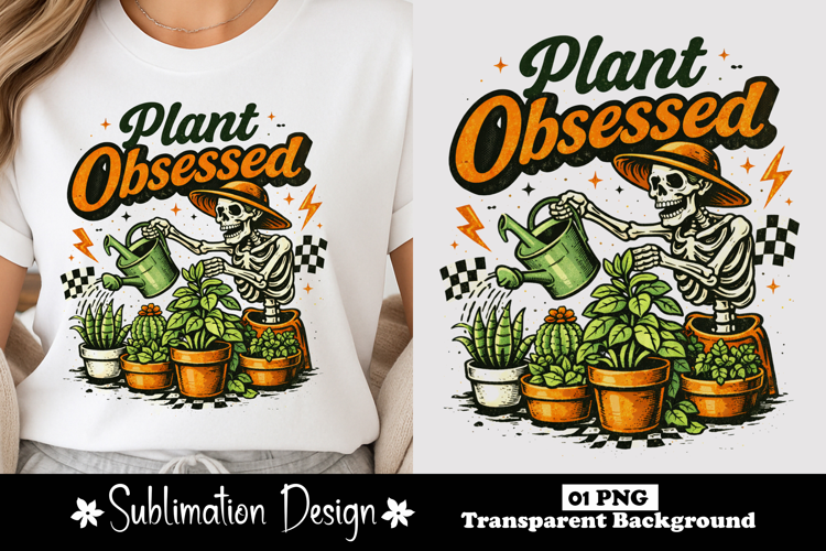 Plant Obsessed Skeleton Watering Plants Sublimation Design example image 1