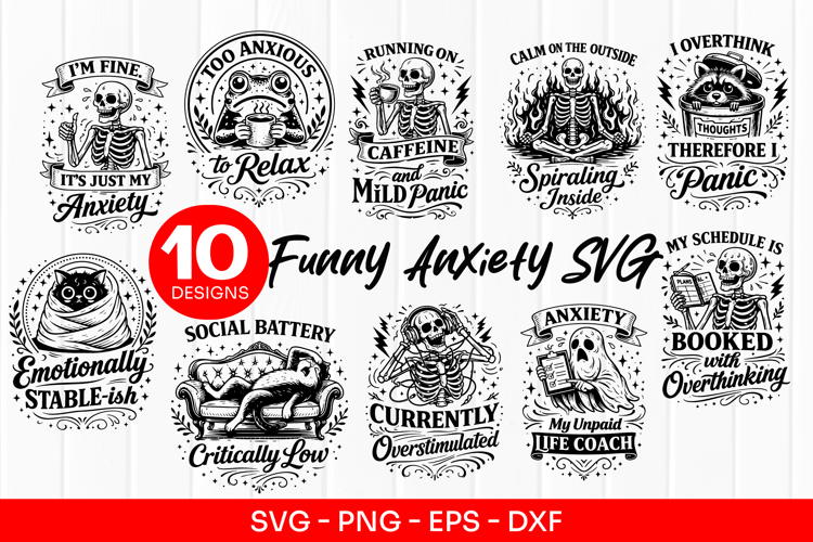 Svg Bundle For Cricut Funny Anxiety Svg Mental Health Quotes Svg Sarcastic Skeleton Design Overthinking Svg File Caffeine And Panic Svg Social Battery Low Svg Emotional Stable Ish Svg Gothic Humor Shirt Design Anxiety Humor Clipart