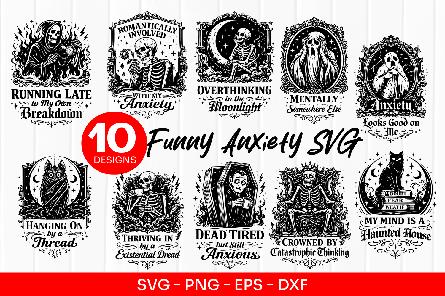 Svg Bundle For Cricut Funny Anxiety Svg Mental Health Quotes Svg Sarcastic Skeleton Design Overthinking Svg File Caffeine And Panic Svg Social Battery Low Svg Emotional Stable Ish Svg Gothic Humor Shirt Design Anxiety Humor Clipart