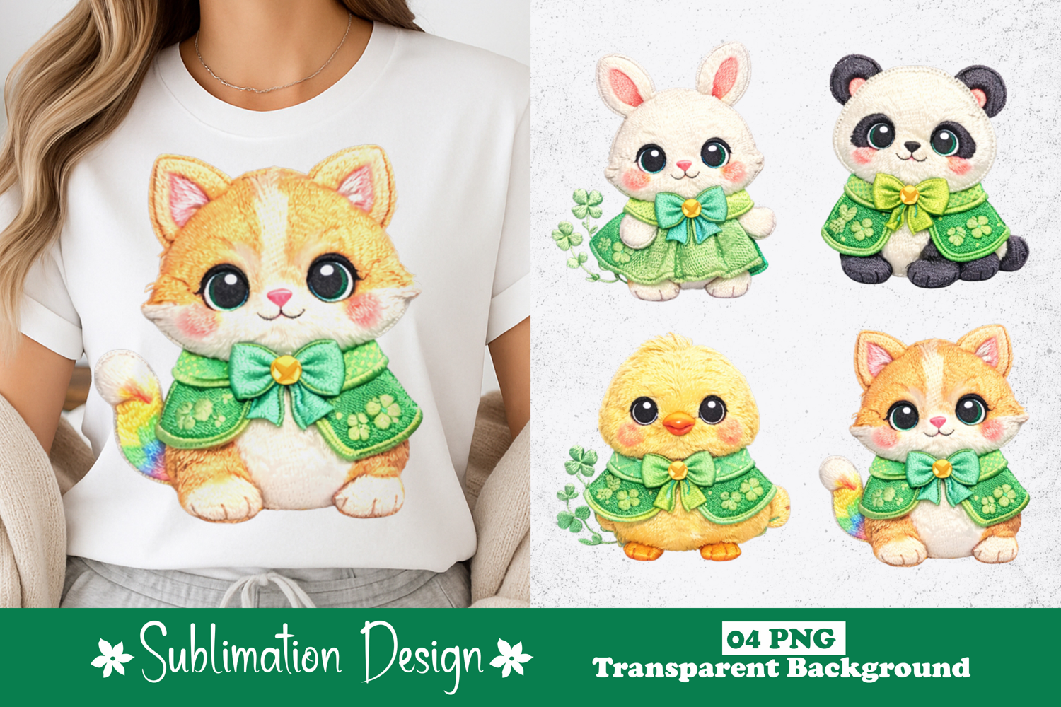 Bunny Illustration Shamrock Leaves Baby Chick Clipart St Patricks Outfit Printable Png File Panda Kawaii Cute Cartoon Style Pastel Animal Art Kitten In Green Cape