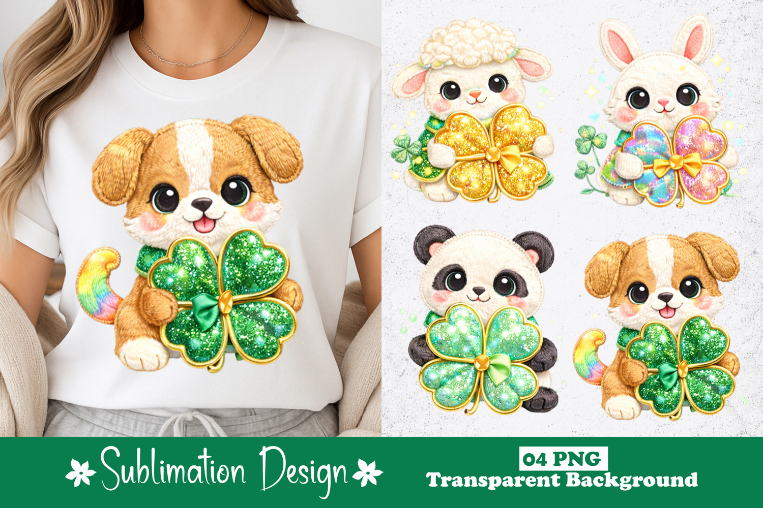 Glitter Shamrock Baby Animals Holding Lucky Clover PNG example image 1