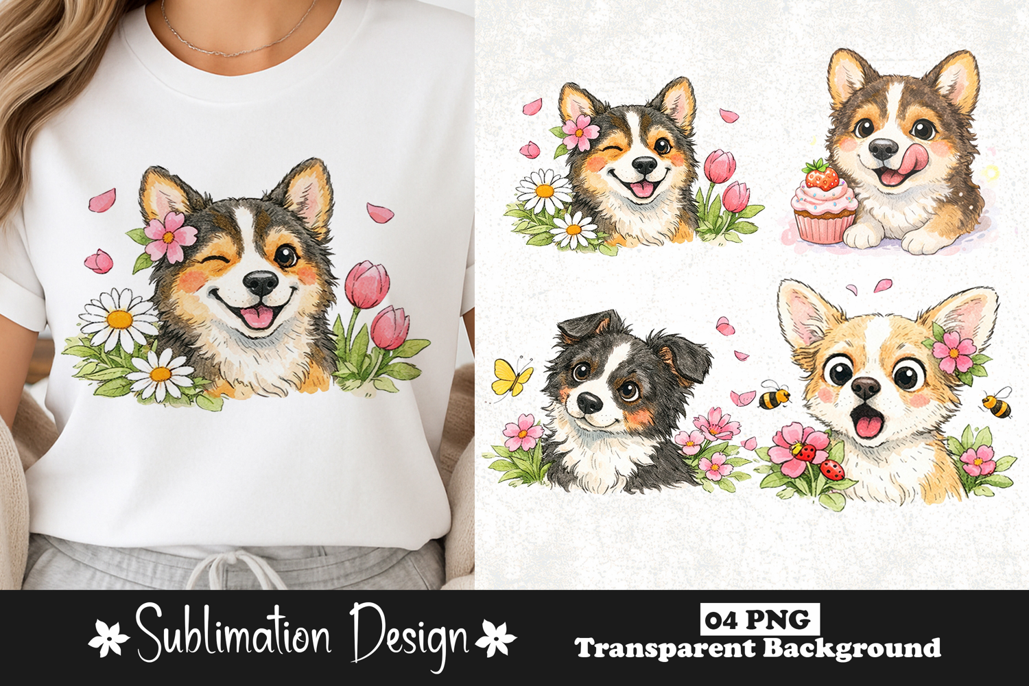 Cute Corgi with Flowers and Spring Elements Watercolor Sublimation Bundle
