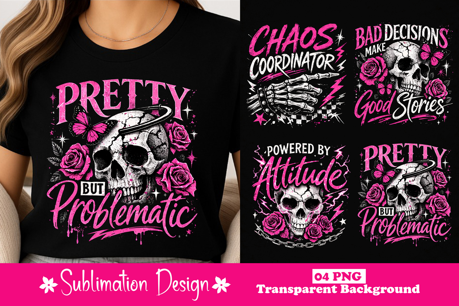 Pretty But Problematic Skull Butterfly Roses Gothic Pink Sublimation Design