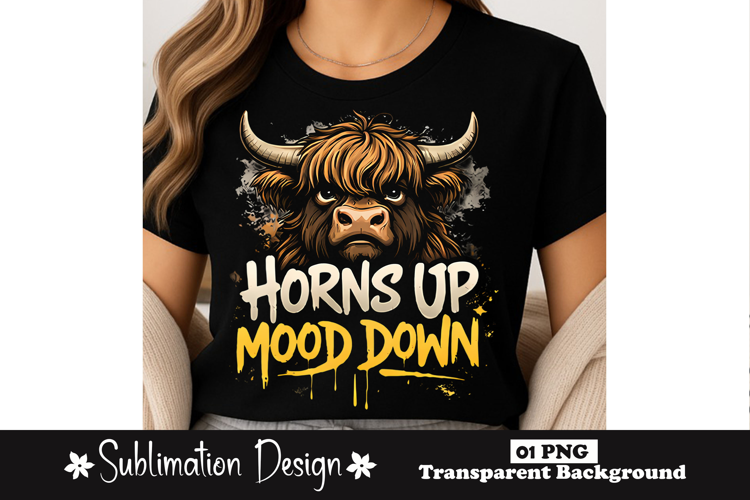 Horns Up Mood Down Funny Highland Cow Sarcastic Sublimation example image 1