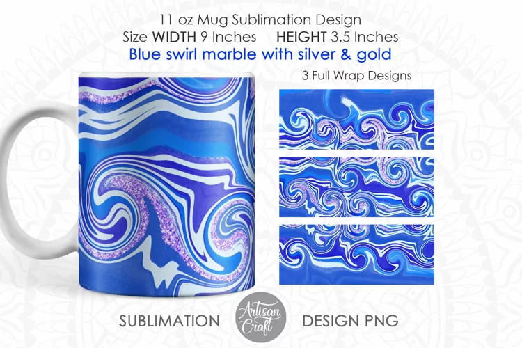 The mug designs PNG for sublimation shows blue swirl marble and glitter. The full wrap mug PNG file can be used as sublimation background and desired text or image can be added. The design of the mug is inspired from movement and beauty of waves of ocean. The blue color used is calming in nature.