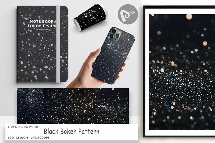 Embark on a journey of artistic excellence with the 4 Pack "Digital Paper Black Bokeh Pattern". Transform your projects into captivating works of art and immerse yourself in a world of endless creativity. Get your hands on this essential collection today and witness the transformative power it holds for your digital and physical creations.
