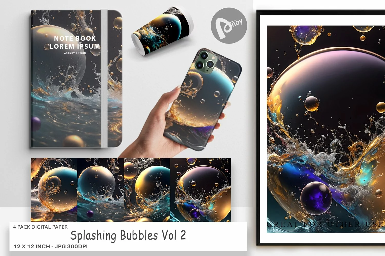 Embark on a journey of artistic excellence with the 4 Pack "Digital Paper Splashing Bubbles". Transform your projects into captivating works of art and immerse yourself in a world of endless creativity. Get your hands on this essential collection today and witness the transformative power it holds for your digital and physical creations.