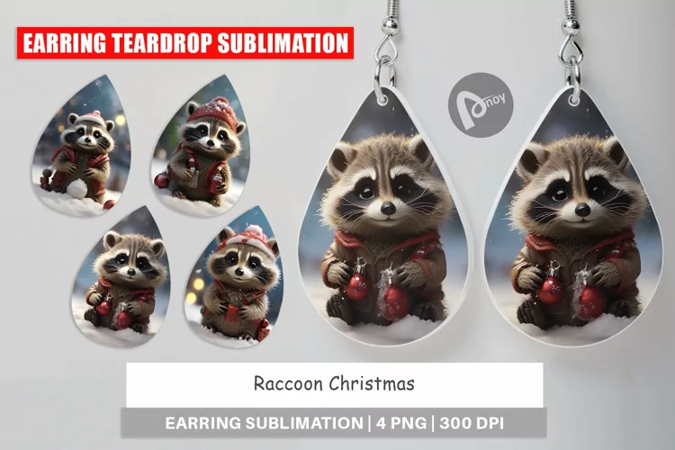 Earring teardrop sublimation design Raccoon Christmas