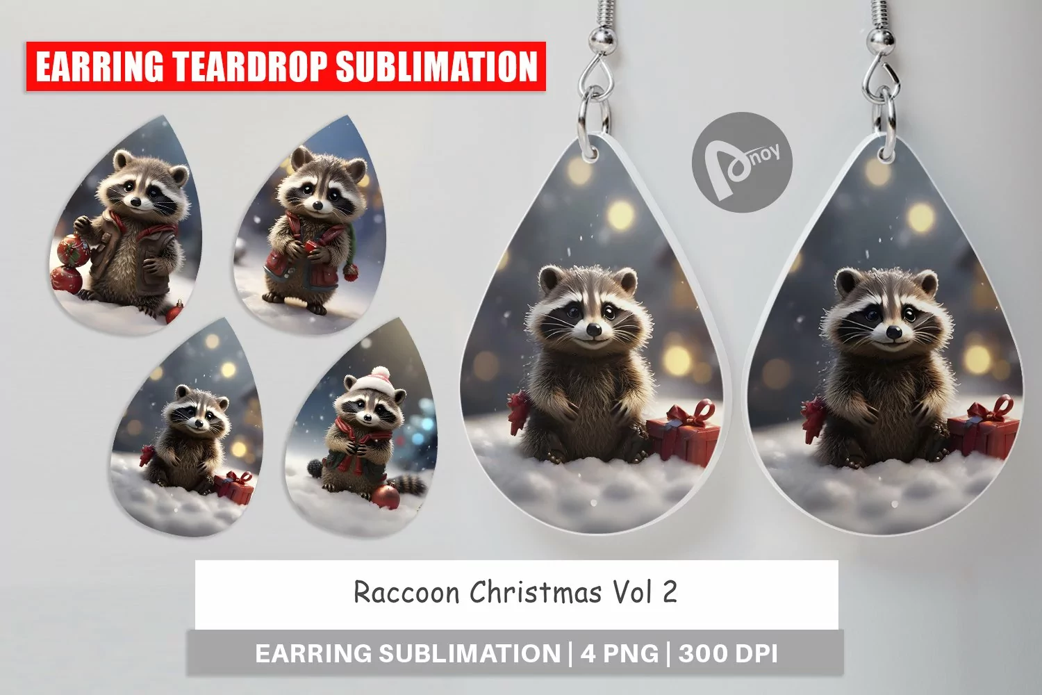 Earring teardrop sublimation design Raccoon Christmas