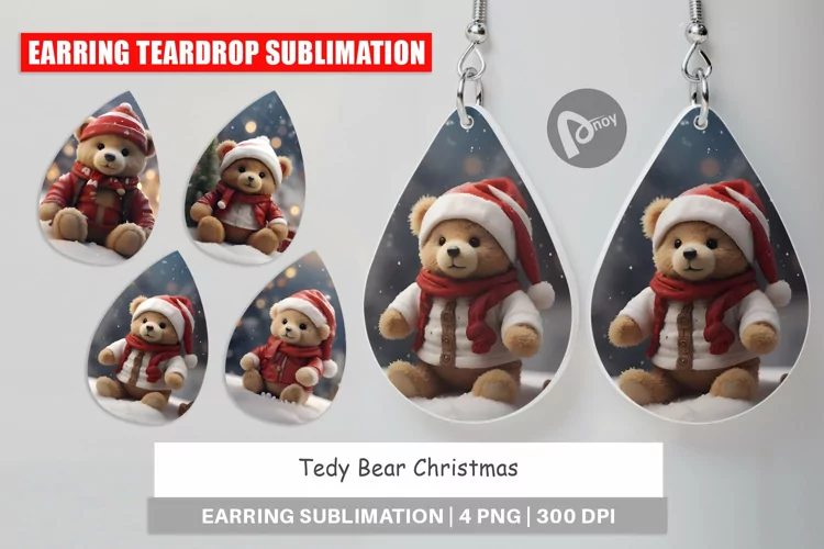 Earring teardrop sublimation design Tedy Bear Christmas