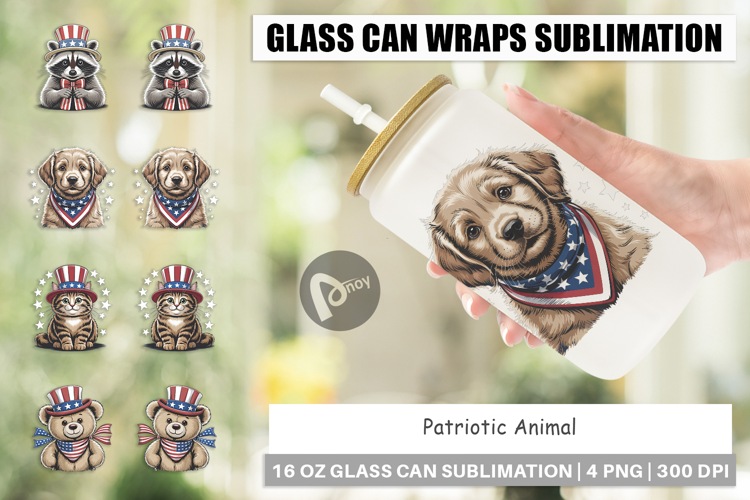 Sublimation Design Patriotic Animal Glass Can Wrap Libbey Glass Beer Can Glass Glass Can Sublimation 16oz Glass Can Wrap Glass Can Wrap Patriotic Animal Glass Can Sublimation Patriotic Animal