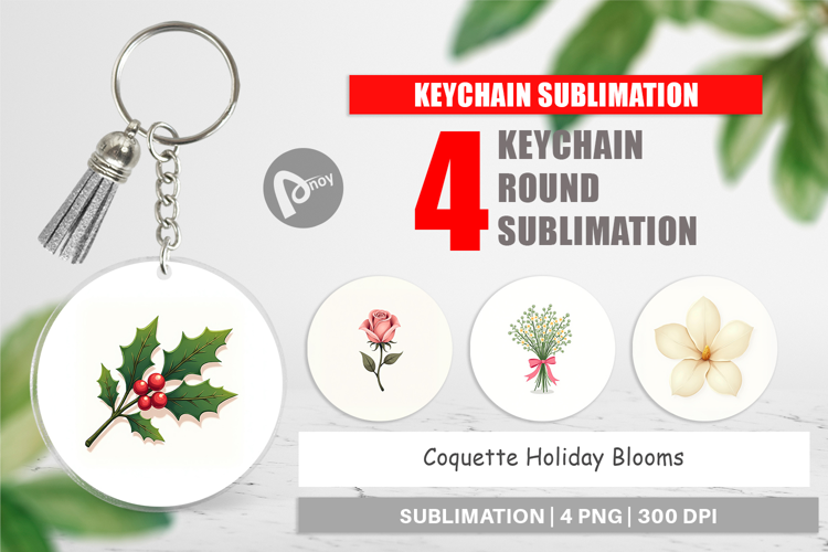 Sublimation Design Keychain Sublimation Round Keychain Png Coquette Aesthetic Bag Tag Design Printable Gift Png Holiday Blooms Background Girly Christmas Gift Coquette Christmas Keychain Floral Holiday Gift