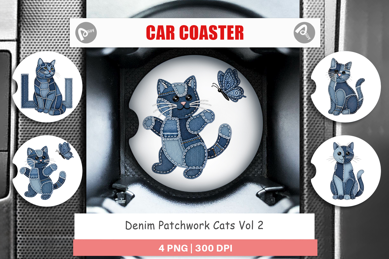 Sublimation Designs Cat Lover Gift Car Coaster Png Car Coaster Sublimation Printable Gift Png Patchwork Cat Design Denim Patchwork Cats Denim Car Decor Cute Pet Accessory Diy Car Coaster