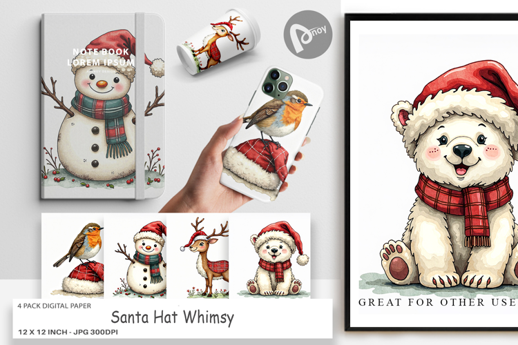 Printable Scrapbook Paper Digital Paper Bundle Junk Journal Supply Holiday Scrapbook Page Sublimation Paper Background Winter Craft Paper Festive Santa Hat Art Santa Hat Paper Whimsy Christmas Background Diy Printable Design