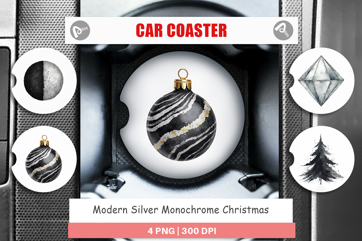 Sublimation Designs Diy Gift Idea Car Coaster Png Car Coaster Sublimation Modern Christmas Design Printable Gift Png Monochrome Holiday Decor Silver Christmas Theme Minimalist Gift Idea Black And White Coaster
