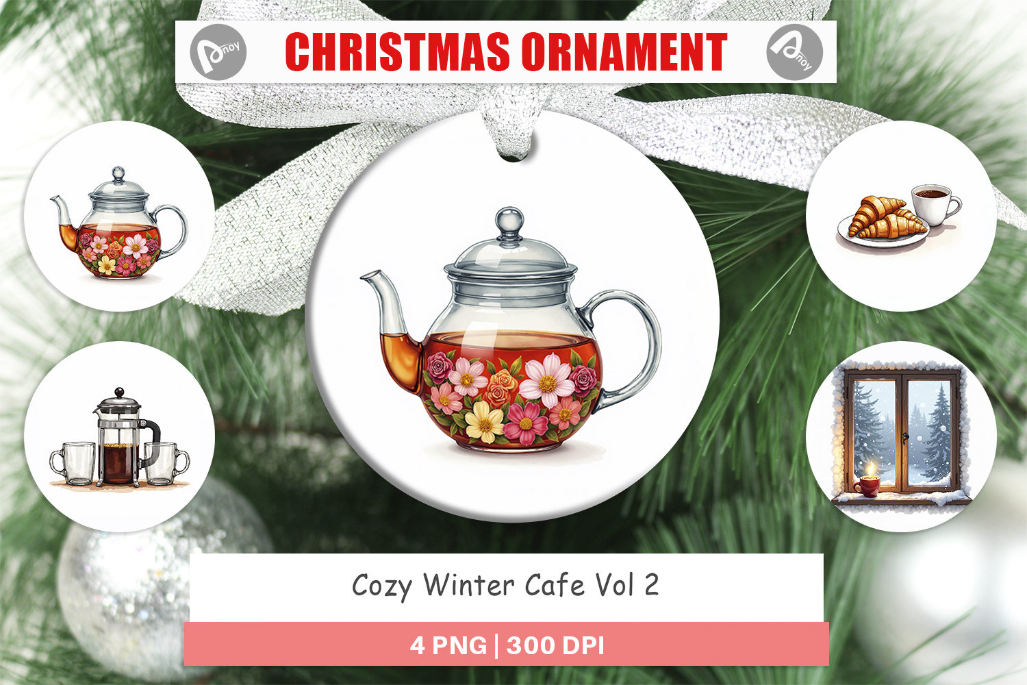Christmas ornaments PNG, printable design, set of 4 circular decorative designs.