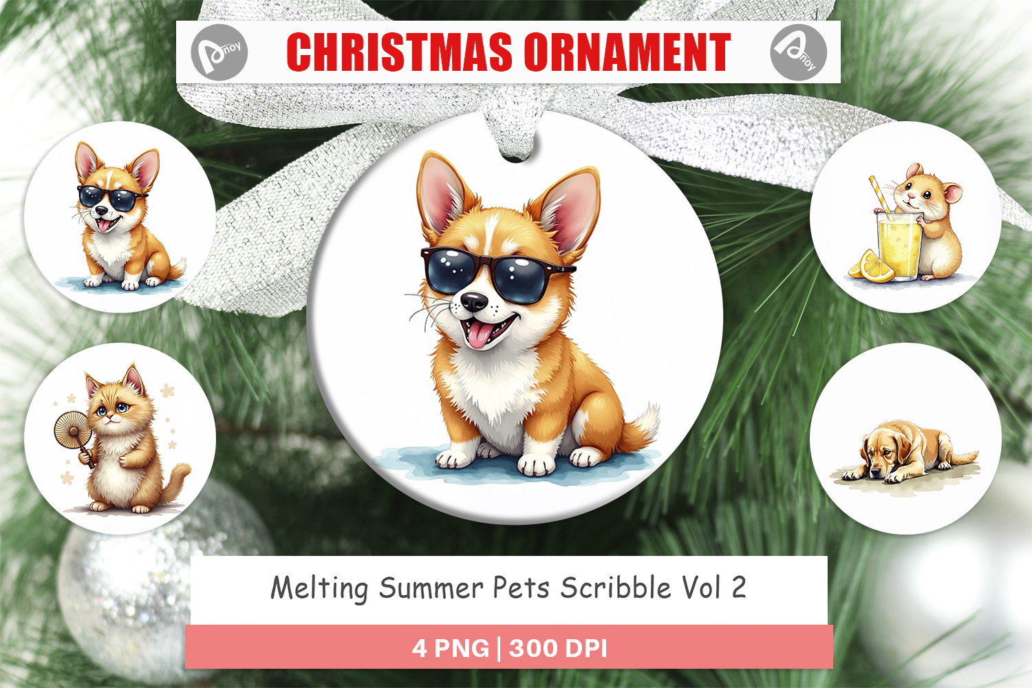 Christmas Decor Sublimation Designs Pet Lover Gift Ornament Design Png Printable Ornament Funny Holiday Gift Round Ornament Sublimation Diy Craft Idea Melting Summer Pet Scribble Pet Art