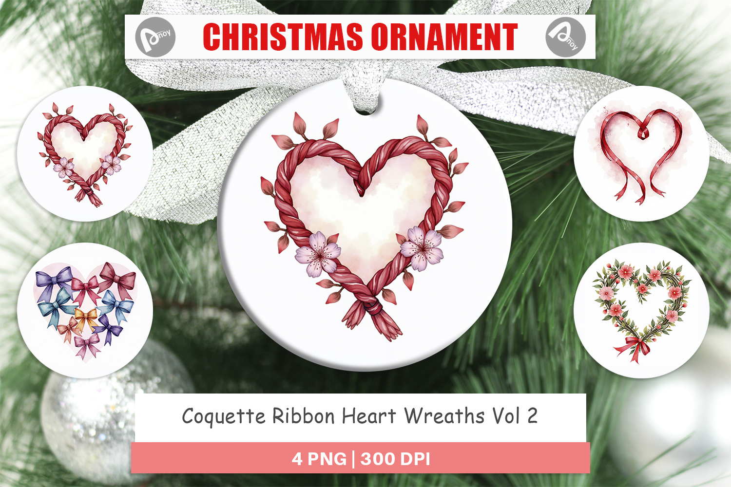 Sublimation Designs Printable Decor Christmas Gift For Her Heart Wreath Png Ornament Design Png Round Ornament Sublimation Diy Holiday Gift Coquette Aesthetic Pink Bow Graphic Coquette Ribbon Ornament